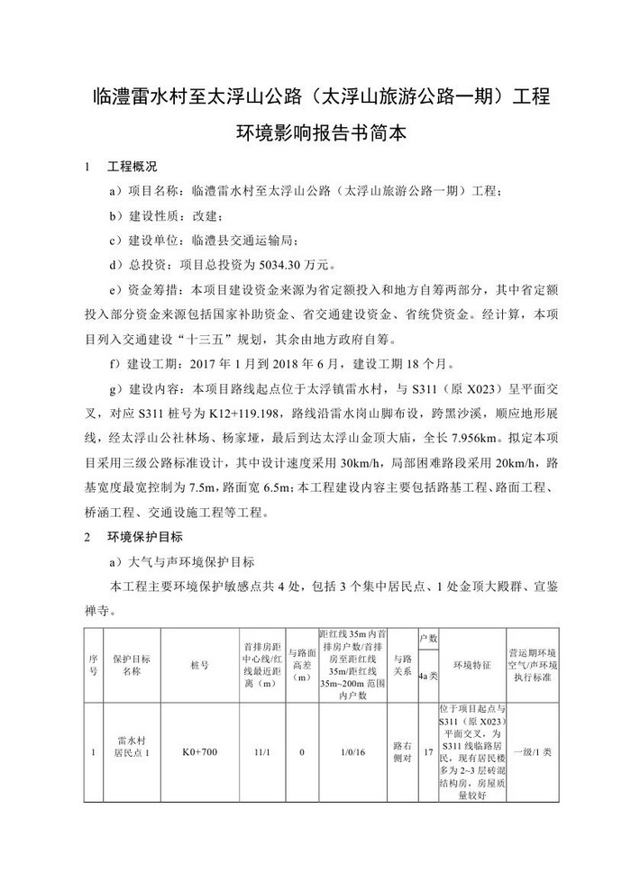 临澧雷水村至太浮山公路(太浮山旅游公路一期)工程环境影响报告书简本