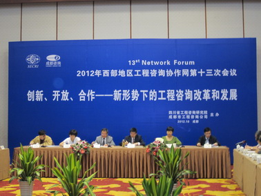 2012年10月10日,西部地区工程咨询协作网第十三次会议在成都召开。来自西部地区的13家成员单位,以及国家发改委国家投资项目评审中心、中国国际工程咨询公司等23家综合性工程咨询单位的特邀代表参会。中心党委委员、总工程师王沛皇参加了会议。