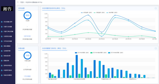 相较于传统的线下业务统计分析,平台的独特优势在于利用线上技术支撑开发了立项签约率、咨询业务监控、各省合同情况等新模块,丰富了数据分析的内容和方式,并通过合同额统计分析的分部门、分类型、分专业细化,使经营数据统计分析效率有了质的飞跃。此外,利用数据库结构与相关算法,在极大程度上解决了大额合同金额统计易出错的问题;将算法与科学化的统计分析方法相结合,进一步拓宽了经营数据的分析维度,为公司科学决策奠定了坚实基础。