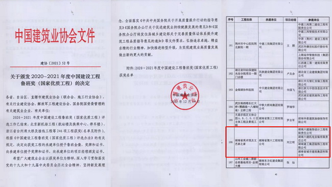 近日,中国建筑业协会公布“2020~2021年度中国建设工程鲁班奖(国家优质工程)获奖工程名单”,省咨询公司代建的湖南省美术馆项目、湖南文艺家之家项目、湖南美术馆展陈装修工程三个项目成功入选。据悉,这是公司代建项目首次荣膺此项殊荣,创造了公司代建工作新的历史。