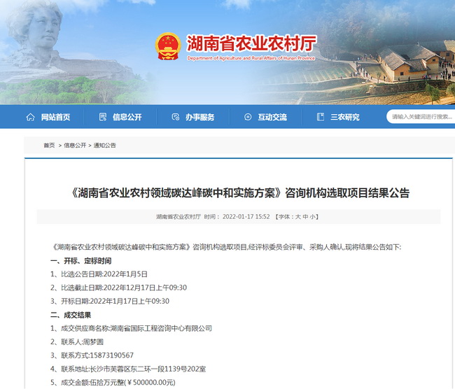 2022年1月17日,经过与众多投标单位的激烈角逐,省咨询公司凭借丰富的咨询经验、强大的技术团队、过硬的成果质量和完善的服务标准顺利中标省农业农村厅《湖南省农业农村领域碳达峰碳中和实施方案》项目,项目中标金额为50万元。