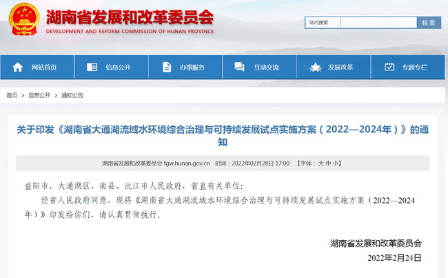 近日,按照国家发展改革委部署,经湖南省政府同意,湖南省发展改革委近日印发了《湖南省大通湖流域水环境综合治理与可持续发展试点实施方案(2022—2024年)》(下称《实施方案》)。《实施方案》系省咨询公司生态规划咨询部编制。