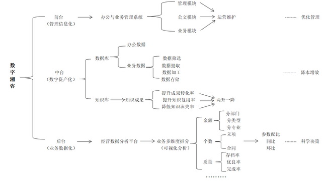目前,公司整体信息化建设已初步形成以办公和业务管理系统为前台依托力、以知识库平台为中台支撑力、以经营数据分析平台为后台驱动力的“三驾马车”并驾齐驱的数字化运营模式,下一步,公司将围绕“管理信息化——数据资产化——业务数字化”转型路线,不断促进公司优化管理、降本增效和科学决策,在深入贯彻省委省政府“数字湖南、数字政府、数字社会”战略进程中,提升“数字湘咨”品牌影响力,助力“数字湖南”高质量发展。