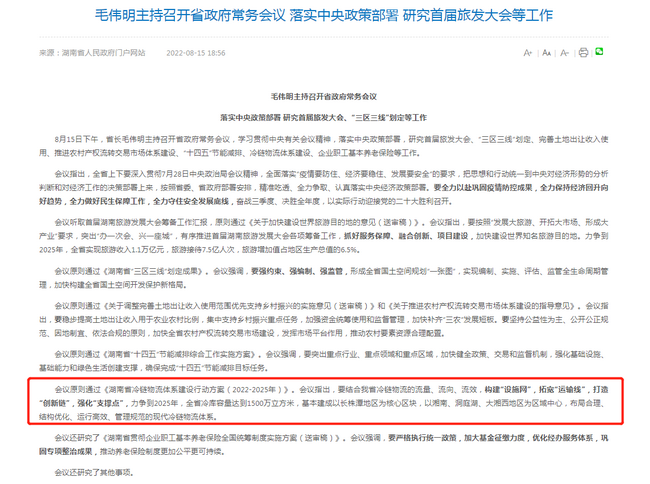 2022年8月15日下午,省长毛伟明主持召开省政府常务会议,研究审议通过了省咨询公司编制的《湖南省冷链物流体系建设行动方案(2022-2025年)》课题,会议指出要结合我省冷链物流的流量、流向、流效,构建“设施网”,拓宽“运输线”,打造“创新链”,强化“支撑点”,力争到2025年,全省冷库容量达到1500万立方米,基本建成以长株潭地区为核心区块,以湘南、洞庭湖、大湘西地区为区域中心,布局合理、结构优化、运行高效、管理规范的现代冷链物流体系。
