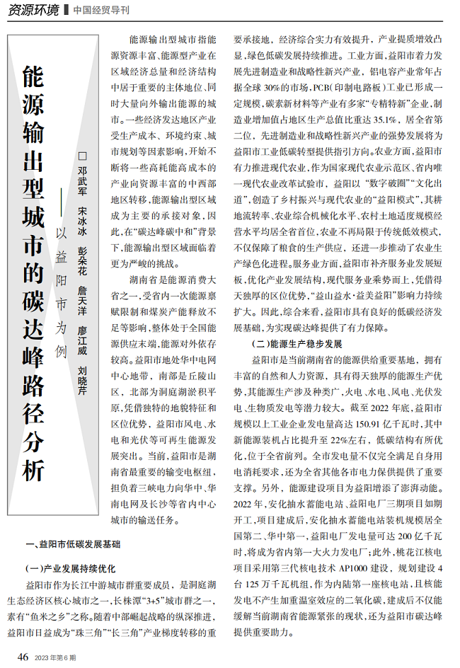 近日,由我司撰写的《能源输出型城市的碳达峰路径分析—以益阳市为例》一文刊发于《中国经贸导刊》2023年第6期,作者为我司生态规划咨询事业部邓武军、彭朵花、詹天洋、廖江威。