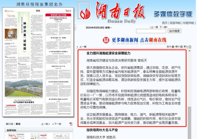 为顺利实现“三高四新”美好蓝图,加快推进高质量发展,湖南省委决定在全省开展解放思想大讨论活动,发起“献策湖南”金点子征集活动。湘咨集团作为省级“智囊团”积极响应,撰写的《全力提升湖南能源安全保障能力》于3月18日被湖南日报摘登发表。