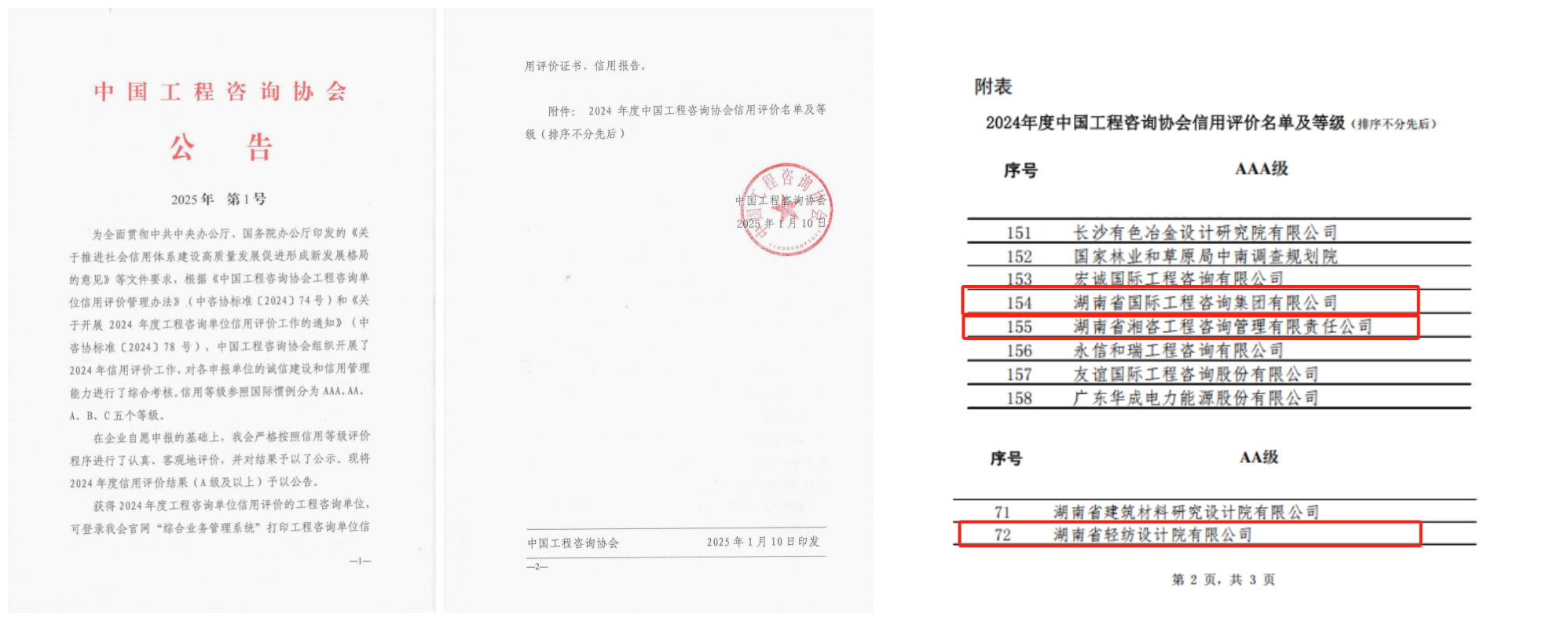 2025年1月10日,中国工程咨询协会(下称“中咨协”)发布2025年第1号公告,湘咨集团成功获评2024年工程咨询单位信用评价等级AAA级。据省咨询协会统计,湖南此次共7家单位获评AAA级,4家单位获评AA级,其中,湘咨集团获评2家AAA级(本部及湘咨管理公司)、1家AA级(省轻纺院)。