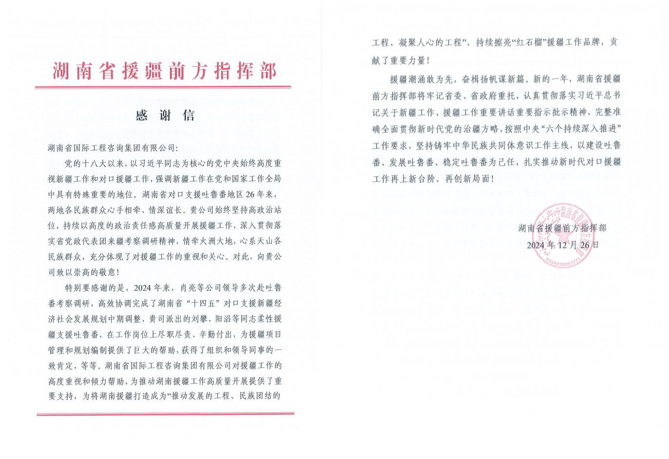 近日,湖南省援疆前方指挥部发来感谢信,对湘咨集团及副总经理肖亮、工作人员刘攀、阳滔等同志在援疆工作中作出的贡献表示感谢。 近年来,湘咨集团积极响应党中央关于援疆······